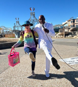 Later, Lenny and I perform near each other. He sings to good music and so I dance to whatever he’s singing. He’s delightful. On his microphone, he comments about me, and I wave.